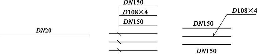 管道管径标注管径应以mm为单位。水煤气输送钢管(镀锌或非镀锌)、铸铁管等管材,管径宜以公称直径DN表示(如DN15、DN50);无缝钢管、螺旋、铜管、不锈钢管等管材,管径宜以外径D×壁厚表示(如D108×4、D159×4.5等);钢筋混凝土(或混凝土)管、陶土管、耐酸陶瓷管、缸瓦管等管材,管径宜以内径d表示(如d230、d380等);塑料管材,管径宜按产品标准的方法表示。当设计均用公称直径DN表示管径时,应用公称直径DN与相应产品规格对照表。