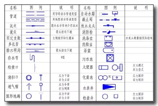 根据建筑规划,在设计图纸中,用水设备的种类、数量、位置,均要作出给水和排水平面布置;各种功能管道、管道附件、卫生器具、用水设备,如消火栓箱、喷头等,均应用各种图例表示;各种横干管、立管、支管的管径、坡度等,均应标出。平面图上管道都用单线绘出,沿墙敷设时不注管道距墙面的距离。