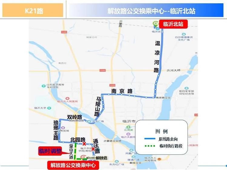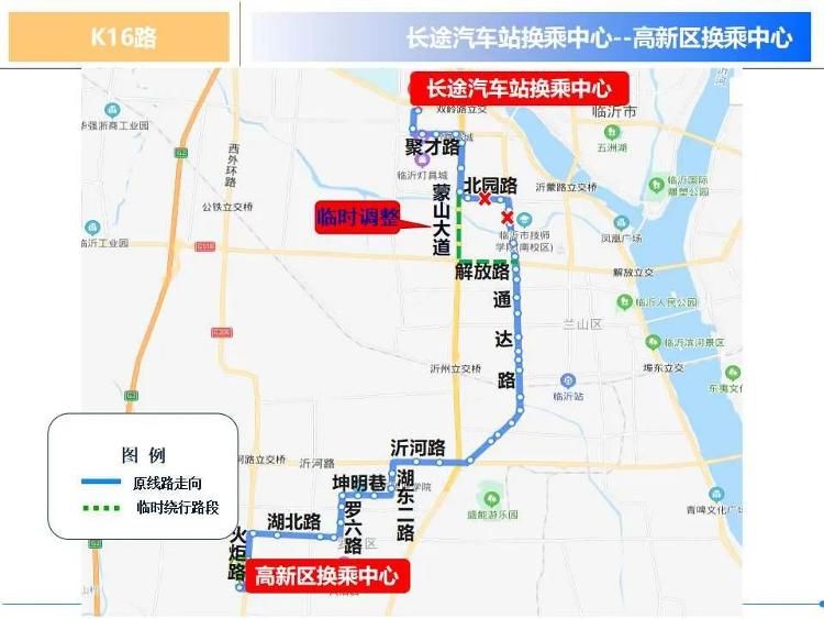 K16路由长途汽车站换乘中心至高新区换乘中心,取消北园路(蒙山大道至通达路路段),通达路(北园路至解放路路段)运营,临时绕行蒙山大道(北园路至解放路路段)、解放路(蒙山大道至通达路路段)后恢复原线路运营,取消停靠:北园花苑、土杂市场、泰鼎花园、百脑汇数码科技广场、山东省鲁南肛肠医院、通达路水田路口北、华丰国际服装城7处站牌,增加停靠:林庄御园、鲁南家具城、金世纪新城、蒙山大道路口、市中医院、临沂新益民眼科医院、华丰国际商贸城7处站牌。