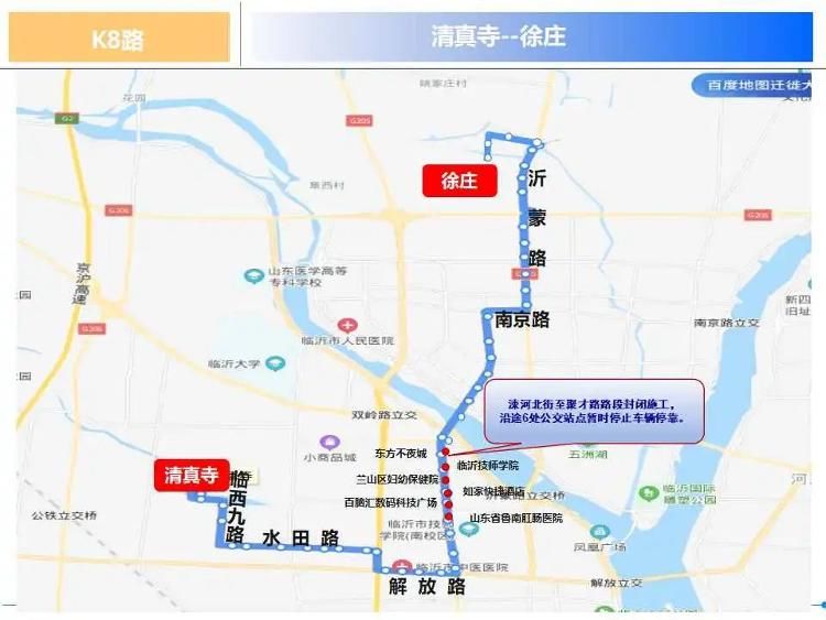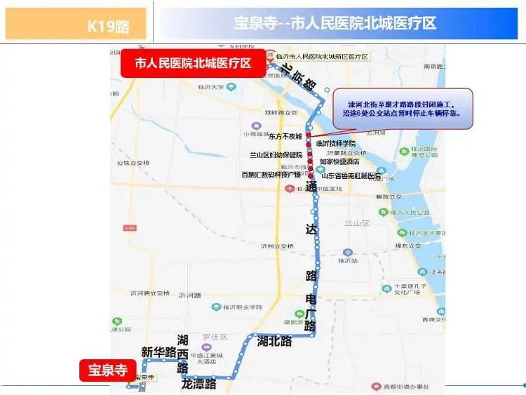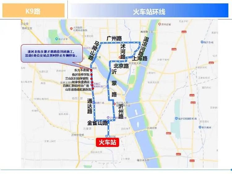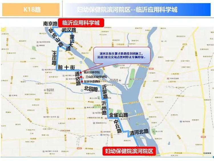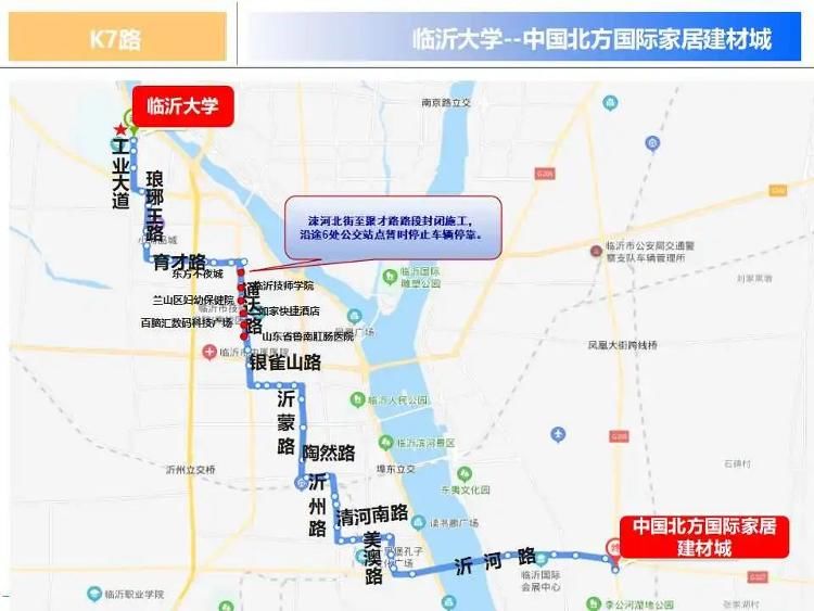 K12路由新沂蒙驾校至北城车站换乘中心,取消聚才路(蒙山大道至通达路路段),通达路(聚才路至解放路路段),解放路(通达路至开源路路段)运营。临时绕行蒙山大道(聚才路至解放路路段)、解放路(蒙山大道至开源路路段)后恢复原线路运营,取消停靠:香江五金机电市场、聚才商务中心、东方不夜城、临沂技师学院、兰山妇幼保健院、如家快捷酒店、百脑汇数码科技广场、山东省鲁南肛肠医院、通达路水田路口北、华丰国际服装城、华丰国际商贸城、临沂新益民眼科医院12处站牌,增加停靠:兰山区地税局、麒麟家具广场、房源高第街、林庄御园、鲁南家具城、金世纪新城、蒙山大道路口、市中医院8处站牌。