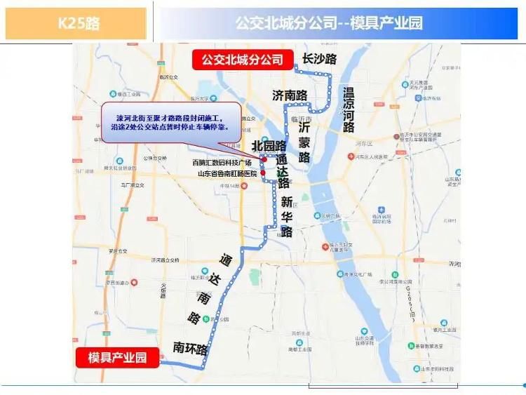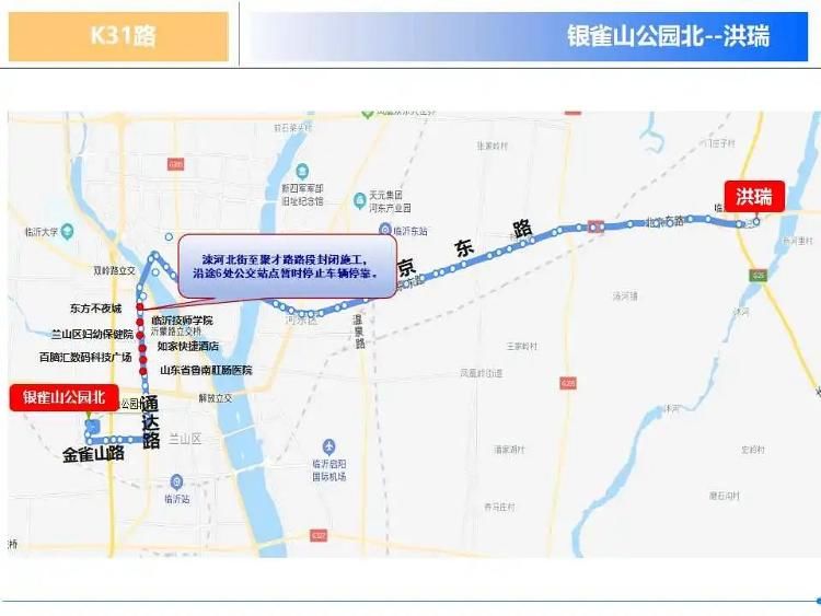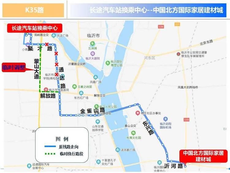 K35路由长途汽车站换乘中心至中国北方国际家居建材城,取消聚才路(蒙山大道至通达路路段),通达路(聚才路至解放路路段)运营,临时绕行蒙山大道(聚才路至解放路路段)、解放路(蒙山大道至通达路路段)后恢复原线路运营,取消停靠:香江五金机电市场、聚才商务中心、东方不夜城、临沂技师学院、兰山妇幼保健院、如家快捷酒店、百脑汇数码科技广场、山东省鲁南肛肠医院、通达路水田路口北、华丰国际服装城10处站牌,增加停靠:兰山区地税局、麒麟家具广场、房源高第街、林庄御园、鲁南家具城、金世纪新城、蒙山大道路口、市中医院、临沂新益民眼科医院、华丰国际商贸城处10处站牌。